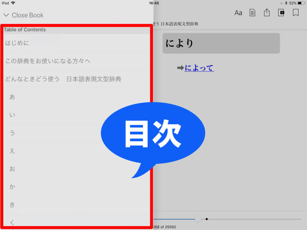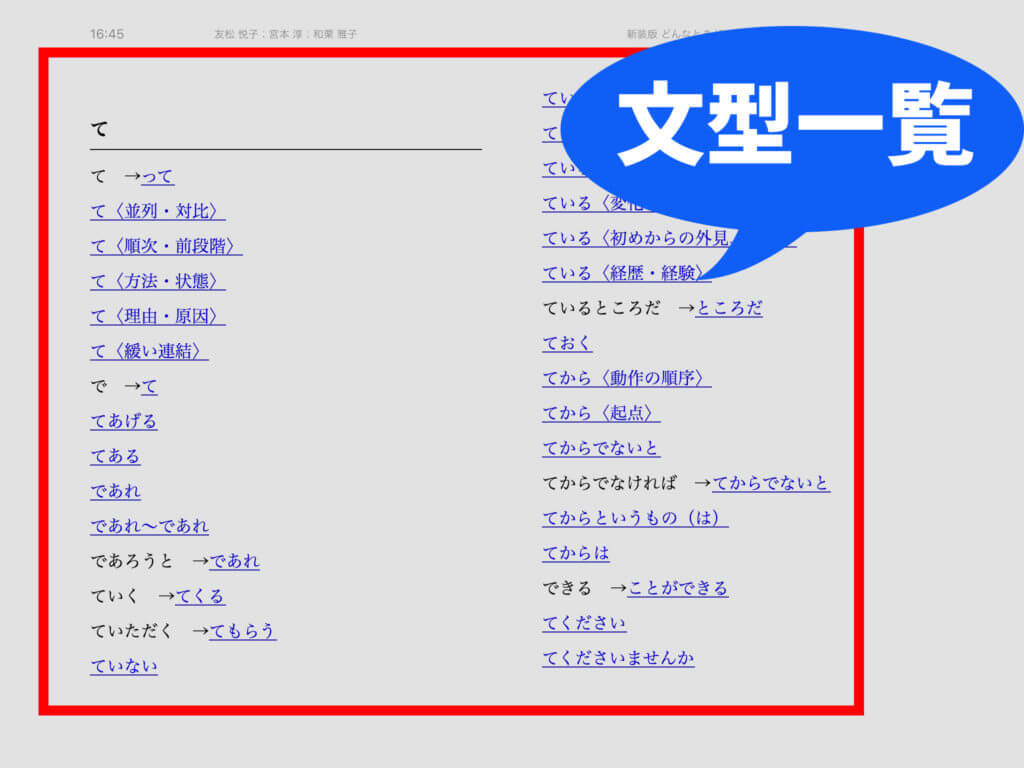 でも、この「どんなとき使う 日本語表現文型辞典」は目次から調べたい文型を簡単に見つけることができ、さらにそのページへリンクしてくれるので、大変便利です。