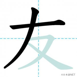 N5 漢字漢字【JLPT N5漢字】「友」の意味・読み方・書き順 2020年8月6日 2022年1月18日 Facebook postはてブLINEPocketFeedlyfa-exclamation-triangle記事内に商品プロモーションが含まれる場合があります目次1 「友」の漢字について2 「友」の書き順3 「友」を含む言葉4 「友」を含むことわざ5 関連書籍「友」の漢字について読み方音読みゆう訓読みとも意味friend部首又画数4JLPTレベルN5 「友」の書き順1画目2画目3画目4画目「友」を含む言葉友達(ともだち):friend親友(しんゆう):best friend友人(ゆうじん):friend友情(ゆうじょう):friendship友好関係(ゆうこうかんけい):friendly relationship「友」を含むことわざ竹馬の友類は友を呼ぶ関連書籍 日本語総まとめ N5 かんじ・ことば・ぶんぽう・読む・聞く [英語・ベトナム語版] Nihongo Soumatome N5 Kanji・Vocabulary・Grammar・Reading・Listening Amazon 楽天市場 Yahooショッピング 日本語を学ぶ外国人のための これで覚える! 漢字字典2500ナツメ社 Amazon 楽天市場 Yahooショッピング Facebook postはてブLINEPocketFeedly