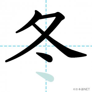 N4 漢字漢字【JLPT N4漢字】「冬」の意味・読み方・書き順 2020年8月18日 2020年8月18日 Facebook postはてブLINEPocketFeedlyfa-exclamation-triangle記事内に商品プロモーションが含まれる場合があります目次1 「冬」の漢字について2 「冬」の書き順3 「冬」を含む言葉4 「冬」を含む四字熟語5 関連書籍「冬」の漢字について読み方音読みとう訓読みふゆ意味winter部首冫画数5JLPTレベルN4 「冬」の書き順1画目2画目3画目4画目5画目「冬」を含む言葉冬(ふゆ)冬休み(ふゆやすみ)冬眠(とうみん)「冬」を含む四字熟語春夏秋冬(しゅんかしゅうとう)関連書籍 日本語総まとめ N4 漢字・ことば [英語・ベトナム語版] Nihongo Soumatome N4 Kanji・Vocabulary Amazon 楽天市場 Yahooショッピング 日本語を学ぶ外国人のための これで覚える! 漢字字典2500ナツメ社 Amazon 楽天市場 Yahooショッピング Facebook postはてブLINEPocketFeedly