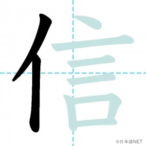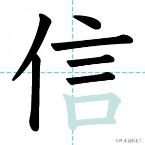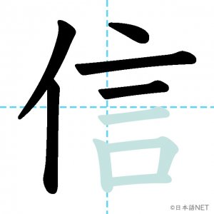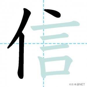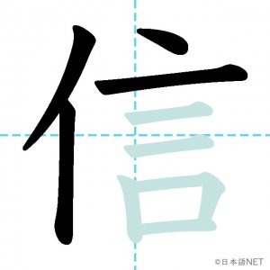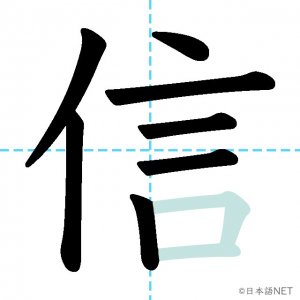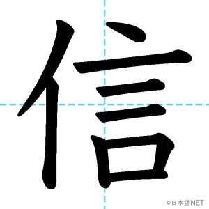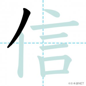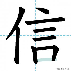 N3 漢字漢字【JLPT N3漢字】「信」の意味・読み方・書き順 2020年8月21日 2020年8月21日 Facebook postはてブLINEPocketFeedlyfa-exclamation-triangle記事内に商品プロモーションが含まれる場合があります目次1 「信」の漢字について2 「信」の書き順3 「信」を含む言葉4 「信」を含む四字熟語5 関連書籍「信」の漢字について読み方音読みしん訓読み-意味to believe部首人画数9JLPTレベルN3 「信」の書き順1画目 2画目3画目4画目 5画目6画目7画目 8画目9画目「信」を含む言葉信じる(しんじる)信号(しんごう)信用(しんよう)自信(じしん)信頼(しんらい)確信(かくしん)「信」を含む四字熟語半信半疑関連書籍 新完全マスター漢字 日本語能力試験N3 Amazon 楽天市場 Yahooショッピング 日本語総まとめ N3 漢字 (「日本語能力試験」対策) Nihongo Soumatome N3 Kanji Kindle Amazon 楽天市場 Yahooショッピング 日本語を学ぶ外国人のための これで覚える! 漢字字典2500ナツメ社 Amazon 楽天市場 Yahooショッピング Facebook postはてブLINEPocketFeedly
