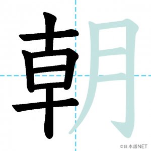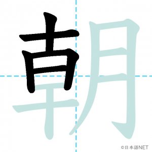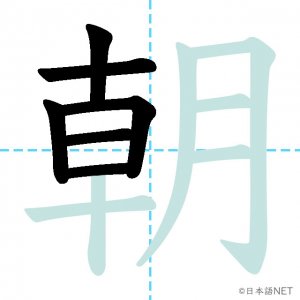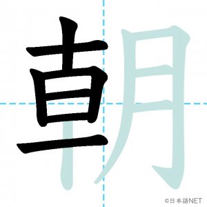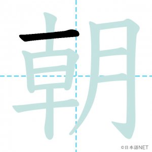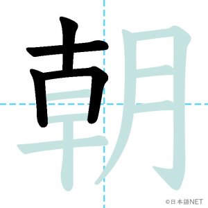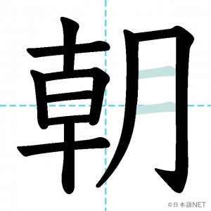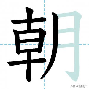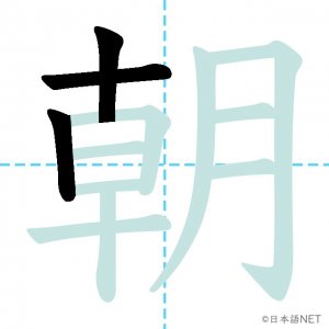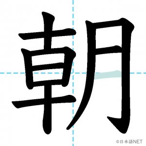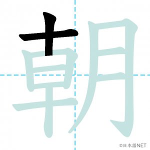 N4 漢字漢字【JLPT N4漢字】「朝」の意味・読み方・書き順 2020年8月26日 2020年8月26日 Facebook postはてブLINEPocketFeedlyfa-exclamation-triangle記事内に商品プロモーションが含まれる場合があります目次1 「朝」の漢字について2 「朝」の書き順3 「朝」を含む言葉4 「朝」を含む四字熟語5 関連書籍「朝」の漢字について読み方音読みちょう訓読みあさ意味morning部首月画数12JLPTレベルN4 「朝」の書き順1画目2画目3画目4画目5画目6画目7画目8画目9画目10画目11画目12画目「朝」を含む言葉朝(あさ)朝ごはん(あさごはん)朝食(ちょうしょく)早朝(そうちょう)毎朝(まいあさ)今朝(けさ)朝寝坊(あさねぼう)「朝」を含む四字熟語一朝一夕(いっちょういっせき)朝三暮四(ちょうさんぼし)関連書籍 日本語総まとめ N4 漢字・ことば [英語・ベトナム語版] Nihongo Soumatome N4 Kanji・Vocabulary Amazon 楽天市場 Yahooショッピング 日本語を学ぶ外国人のための これで覚える! 漢字字典2500ナツメ社 Amazon 楽天市場 Yahooショッピング Facebook postはてブLINEPocketFeedly