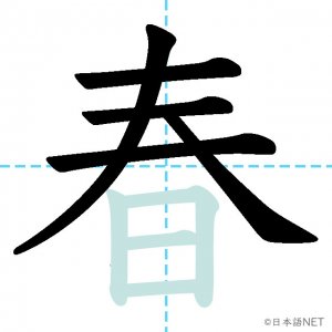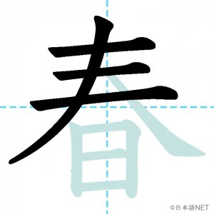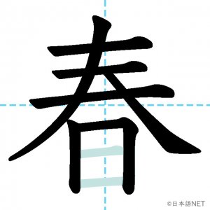 N4 漢字漢字【JLPT N4漢字】「春」の意味・読み方・書き順 2020年8月26日 2020年8月26日 Facebook postはてブLINEPocketFeedlyfa-exclamation-triangle記事内に商品プロモーションが含まれる場合があります目次1 「春」の漢字について2 「春」の書き順3 「春」を含む言葉4 「春」を含む四字熟語5 関連書籍「春」の漢字について読み方音読みしゅん訓読みはる意味spring部首日画数9JLPTレベルN4 「春」の書き順1画目2画目3画目4画目5画目6画目7画目8画目9画目「春」を含む言葉春(はる)青春(せいしゅん)「春」を含む四字熟語小春日和(こはるびより)春夏秋冬(しゅんかしゅうとう)関連書籍 日本語総まとめ N4 漢字・ことば [英語・ベトナム語版] Nihongo Soumatome N4 Kanji・Vocabulary Amazon 楽天市場 Yahooショッピング 日本語を学ぶ外国人のための これで覚える! 漢字字典2500ナツメ社 Amazon 楽天市場 Yahooショッピング Facebook postはてブLINEPocketFeedly