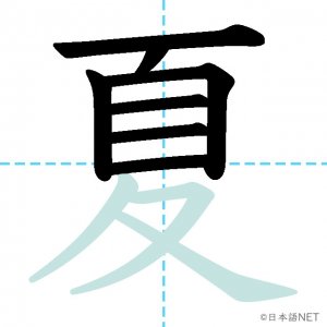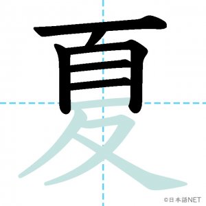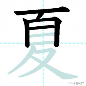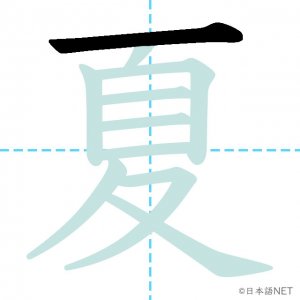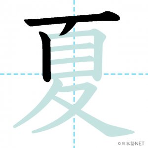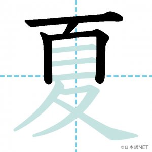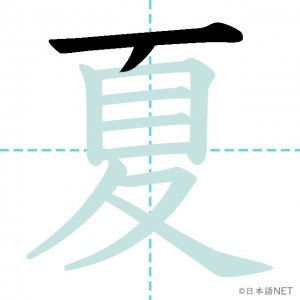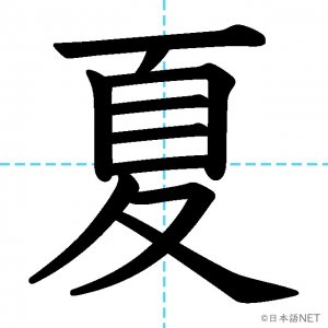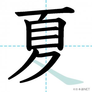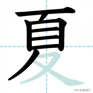 N4 漢字漢字【JLPT N4漢字】「夏」の意味・読み方・書き順 2020年8月26日 2020年8月26日 Facebook postはてブLINEPocketFeedlyfa-exclamation-triangle記事内に商品プロモーションが含まれる場合があります目次1 「夏」の漢字について2 「夏」の書き順3 「夏」を含む言葉4 「夏」を含む四字熟語5 「夏」を含むことわざ6 関連書籍「夏」の漢字について読み方音読みか が げ訓読みなつ意味summer部首夊画数10JLPTレベルN4 「夏」の書き順1画目2画目3画目4画目5画目6画目7画目8画目9画目10画目「夏」を含む言葉夏(なつ)夏休み(なつやすみ)真夏(まなつ)夏至(げし)「夏」を含む四字熟語春夏秋冬(しゅんかしゅうとう)「夏」を含むことわざ飛んで火にいる夏の虫関連書籍 日本語総まとめ N4 漢字・ことば [英語・ベトナム語版] Nihongo Soumatome N4 Kanji・Vocabulary Amazon 楽天市場 Yahooショッピング 日本語を学ぶ外国人のための これで覚える! 漢字字典2500ナツメ社 Amazon 楽天市場 Yahooショッピング Facebook postはてブLINEPocketFeedly