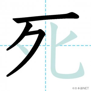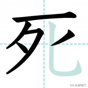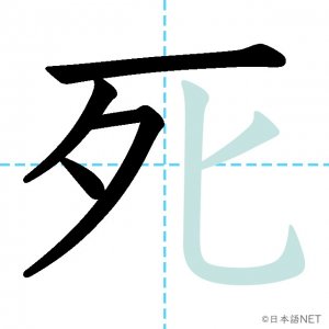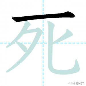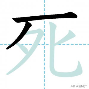N4 漢字漢字【JLPT N4漢字】「死」の意味・読み方・書き順 2020年8月28日 2020年8月28日 Facebook postはてブLINEPocketFeedlyfa-exclamation-triangle記事内に商品プロモーションが含まれる場合があります目次1 「死」の漢字について2 「死」の書き順3 「死」を含む言葉4 「死」を含む四字熟語5 関連書籍「死」の漢字について読み方音読みし訓読みし-ぬ意味death / to die部首歹画数6JLPTレベルN4 「死」の書き順1画目2画目3画目4画目5画目6画目「死」を含む言葉死ぬ(しぬ)必死(ひっし)死神(しにがみ)生死(せいし)「死」を含む四字熟語起死回生(きしかいせい)九死一生(きゅうしいっしょう)関連書籍 日本語総まとめ N4 漢字・ことば [英語・ベトナム語版] Nihongo Soumatome N4 Kanji・Vocabulary Amazon 楽天市場 Yahooショッピング 日本語を学ぶ外国人のための これで覚える! 漢字字典2500ナツメ社 Amazon 楽天市場 Yahooショッピング Facebook postはてブLINEPocketFeedly