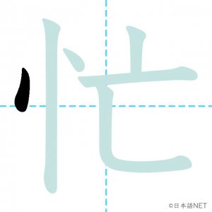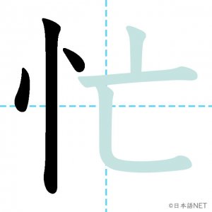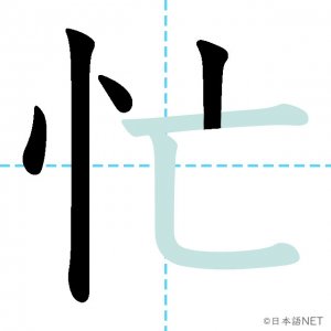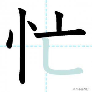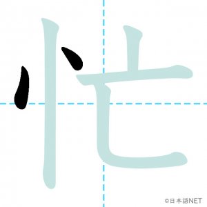 N3 漢字漢字【JLPT N3漢字】「忙」の意味・読み方・書き順 2020年10月23日 2020年10月23日 Facebook postはてブLINEPocketFeedlyfa-exclamation-triangle記事内に商品プロモーションが含まれる場合があります目次1 「忙」の漢字について2 「忙」の書き順3 「忙」を含む言葉4 関連書籍「忙」の漢字について読み方音読みぼう訓読みいそが-しい意味busy部首心(忄⺗)画数6JLPTレベルN3 「忙」の書き順1画目2画目3画目4画目5画目6画目「忙」を含む言葉忙しい(いそがしい)多忙な(たぼうな)関連書籍 新完全マスター漢字 日本語能力試験N3 Amazon 楽天市場 Yahooショッピング 日本語総まとめ N3 漢字 (「日本語能力試験」対策) Nihongo Soumatome N3 Kanji Kindle Amazon 楽天市場 Yahooショッピング 日本語を学ぶ外国人のための これで覚える! 漢字字典2500ナツメ社 Amazon 楽天市場 Yahooショッピング Facebook postはてブLINEPocketFeedly