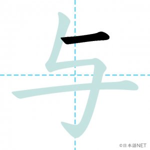 N3 漢字漢字【JLPT N3漢字】「与」の意味・読み方・書き順 2020年11月5日 2020年11月5日 Facebook postはてブLINEPocketFeedlyfa-exclamation-triangle記事内に商品プロモーションが含まれる場合があります目次1 「与」の漢字について2 「与」の書き順3 「与」を含む言葉4 関連書籍「与」の漢字について読み方音読みよ訓読みあた-える意味to give / to bestow部首一画数3JLPTレベルN3 「与」の書き順1画目2画目3画目「与」を含む言葉与える(あたえる)贈与(ぞうよ)給与(きゅうよ)関与(かんよ)関連書籍 新完全マスター漢字 日本語能力試験N3 Amazon 楽天市場 Yahooショッピング 日本語総まとめ N3 漢字 (「日本語能力試験」対策) Nihongo Soumatome N3 Kanji Kindle Amazon 楽天市場 Yahooショッピング 日本語を学ぶ外国人のための これで覚える! 漢字字典2500ナツメ社 Amazon 楽天市場 Yahooショッピング Facebook postはてブLINEPocketFeedly