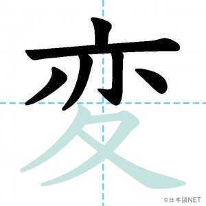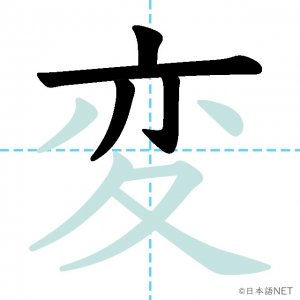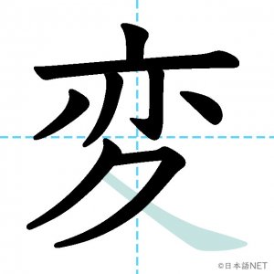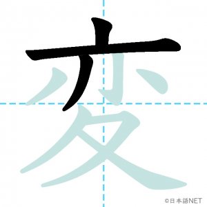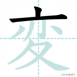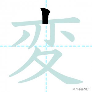 N3 漢字漢字【JLPT N3漢字】「変」の意味・読み方・書き順 2020年11月12日 2020年11月12日 Facebook postはてブLINEPocketFeedlyfa-exclamation-triangle記事内に商品プロモーションが含まれる場合があります目次1 「変」の漢字について2 「変」の書き順3 「変」を含む言葉4 関連書籍「変」の漢字について読み方音読みへん訓読みか-わる か-える意味to change / unusual部首夂画数9JLPTレベルN3 「変」の書き順1画目2画目3画目4画目5画目6画目7画目8画目9画目「変」を含む言葉変わる(かわる)変な(へんな)大変な(たいへんな)変化(へんか)変更(へんこう)変動(へんどう)関連書籍 新完全マスター漢字 日本語能力試験N3 Amazon 楽天市場 Yahooショッピング 日本語総まとめ N3 漢字 (「日本語能力試験」対策) Nihongo Soumatome N3 Kanji Kindle Amazon 楽天市場 Yahooショッピング 日本語を学ぶ外国人のための これで覚える! 漢字字典2500ナツメ社 Amazon 楽天市場 Yahooショッピング Facebook postはてブLINEPocketFeedly