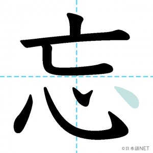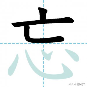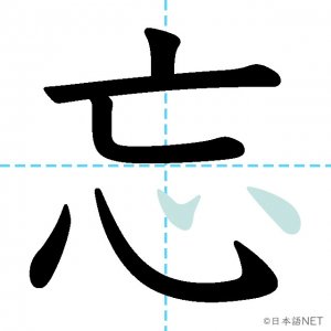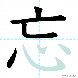 N3 漢字漢字【JLPT N3漢字】「忘」の意味・読み方・書き順 2020年11月12日 2020年11月12日 Facebook postはてブLINEPocketFeedlyfa-exclamation-triangle記事内に商品プロモーションが含まれる場合があります目次1 「忘」の漢字について2 「忘」の書き順3 「忘」を含む言葉4 関連書籍「忘」の漢字について読み方音読みぼう訓読みわす-れる意味to forget部首心(忄⺗)画数7JLPTレベルN3 「忘」の書き順1画目2画目3画目4画目5画目6画目7画目「忘」を含む言葉忘れる(わすれる)忘れ物(わすれもの)忘年会(ぼうねんかい)物忘れ(ものわすれ)関連書籍 新完全マスター漢字 日本語能力試験N3 Amazon 楽天市場 Yahooショッピング 日本語総まとめ N3 漢字 (「日本語能力試験」対策) Nihongo Soumatome N3 Kanji Kindle Amazon 楽天市場 Yahooショッピング 日本語を学ぶ外国人のための これで覚える! 漢字字典2500ナツメ社 Amazon 楽天市場 Yahooショッピング Facebook postはてブLINEPocketFeedly