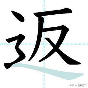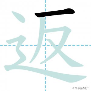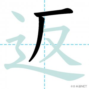 N3 漢字漢字【JLPT N3漢字】「返」の意味・読み方・書き順 2020年11月29日 2020年11月29日 Facebook postはてブLINEPocketFeedlyfa-exclamation-triangle記事内に商品プロモーションが含まれる場合があります目次1 「返」の漢字について2 「返」の書き順3 「返」を含む言葉4 関連書籍「返」の漢字について読み方音読みへん訓読みかえ-す かえ-る意味to return部首⻍(⻌)画数7JLPTレベルN3 「返」の書き順1画目2画目3画目4画目5画目6画目7画目「返」を含む言葉返す(かえす)返事(へんじ)繰り返す(くりかえす)振り返る(ふりかえる)返却(へんきゃく)返信(へんしん)返答(へんとう)返済(へんさい)宙返り(ちゅうがえり)関連書籍 新完全マスター漢字 日本語能力試験N3 Amazon 楽天市場 Yahooショッピング 日本語総まとめ N3 漢字 (「日本語能力試験」対策) Nihongo Soumatome N3 Kanji Kindle Amazon 楽天市場 Yahooショッピング 日本語を学ぶ外国人のための これで覚える! 漢字字典2500ナツメ社 Amazon 楽天市場 Yahooショッピング Facebook postはてブLINEPocketFeedly