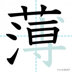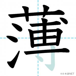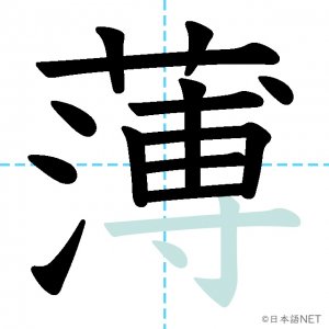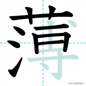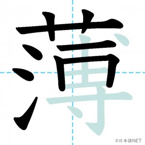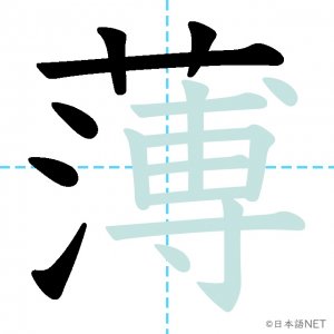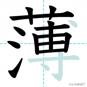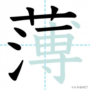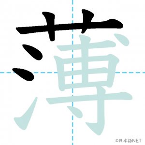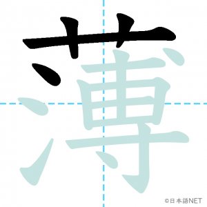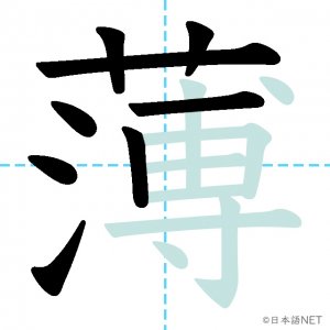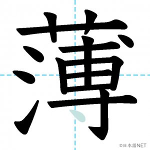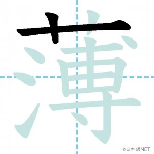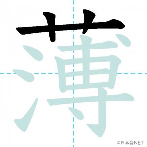N3 漢字漢字【JLPT N3漢字】「薄」の意味・読み方・書き順 2021年1月21日 2021年1月21日 Facebook postはてブLINEPocketFeedlyfa-exclamation-triangle記事内に商品プロモーションが含まれる場合があります目次1 「薄」の漢字について2 「薄」の書き順3 「薄」を含む言葉4 関連書籍「薄」の漢字について読み方音読みはく訓読みうす-い うす-める うす-まる うす-らぐ うす-れる意味 thin / dilute部首艸 (艹)画数16JLPTレベルN3 「薄」の書き順1画目2画目3画目4画目5画目6画目7画目8画目9画目10画目11画目12画目13画目14画目15画目16画目「薄」を含む言葉薄い(うすい)薄暗い(うすぐらい)薄給(はっきゅう)希薄(きはく)薄弱(はくじゃく)関連書籍 新完全マスター漢字 日本語能力試験N3 Amazon 楽天市場 Yahooショッピング 日本語総まとめ N3 漢字 (「日本語能力試験」対策) Nihongo Soumatome N3 Kanji Kindle Amazon 楽天市場 Yahooショッピング 日本語を学ぶ外国人のための これで覚える! 漢字字典2500ナツメ社 Amazon 楽天市場 Yahooショッピング Facebook postはてブLINEPocketFeedly