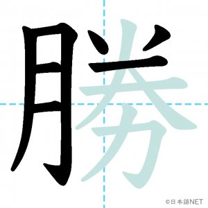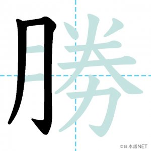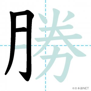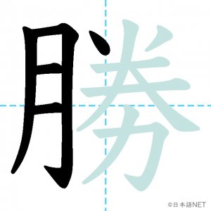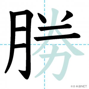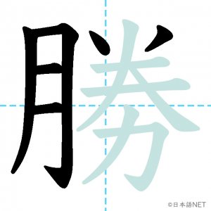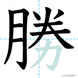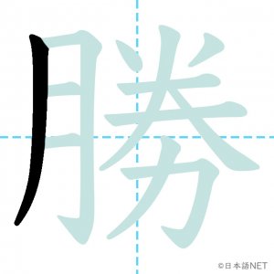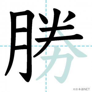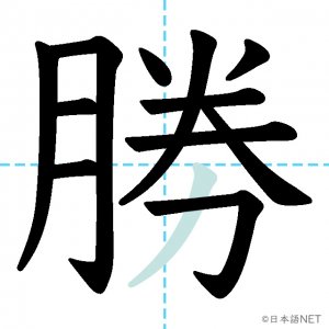 N3 漢字漢字【JLPT N3漢字】「勝」の意味・読み方・書き順 2021年1月22日 2021年1月22日 Facebook postはてブLINEPocketFeedlyfa-exclamation-triangle記事内に商品プロモーションが含まれる場合があります目次1 「勝」の漢字について2 「勝」の書き順3 「勝」を含む言葉4 関連書籍「勝」の漢字について読み方音読みしょう訓読みか-つ まさ-る意味to win / victory部首力画数12JLPTレベルN3 「勝」の書き順1画目2画目3画目4画目5画目6画目7画目8画目9画目10画目11画目12画目「勝」を含む言葉勝つ(かつ)勝利(しょうり)優勝(ゆうしょう)勝敗(しょうはい)決勝(けっしょう)勝負(しょうぶ)必勝(ひっしょう)勝る(まさる)連勝(れんしょう)関連書籍 新完全マスター漢字 日本語能力試験N3 Amazon 楽天市場 Yahooショッピング 日本語総まとめ N3 漢字 (「日本語能力試験」対策) Nihongo Soumatome N3 Kanji Kindle Amazon 楽天市場 Yahooショッピング 日本語を学ぶ外国人のための これで覚える! 漢字字典2500ナツメ社 Amazon 楽天市場 Yahooショッピング Facebook postはてブLINEPocketFeedly