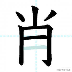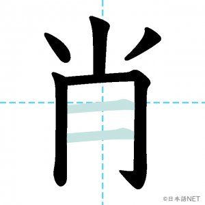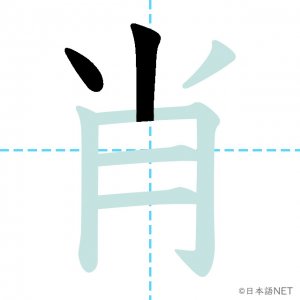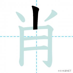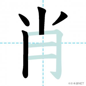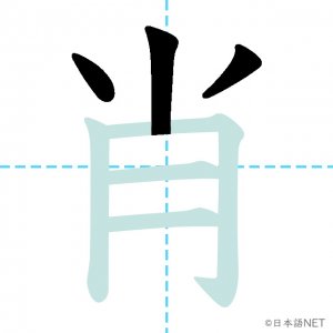 N1 漢字漢字【JLPT N1漢字】「肖」の意味・読み方・書き順 2021年2月9日 2021年2月9日 Facebook postはてブLINEPocketFeedlyfa-exclamation-triangle記事内に商品プロモーションが含まれる場合があります目次1 「肖」の漢字について2 「肖」の書き順3 「肖」を含む言葉4 関連書籍「肖」の漢字について読み方音読みしょう訓読み-意味to resemble部首肉(⺼)画数7JLPTレベルN1 「肖」の書き順1画目2画目3画目4画5画目6画目7画目「肖」を含む言葉肖像(しょうぞう)肖像画(しょうぞうが)関連書籍 日本語総まとめ N1 漢字 [英語・ベトナム語版] (「日本語能力試験」対策) Amazon 楽天市場 Yahooショッピング 新完全マスター漢字 日本語能力試験N1 Amazon 楽天市場 Yahooショッピング 日本語を学ぶ外国人のための これで覚える! 漢字字典2500ナツメ社 Amazon 楽天市場 Yahooショッピング Facebook postはてブLINEPocketFeedly
