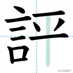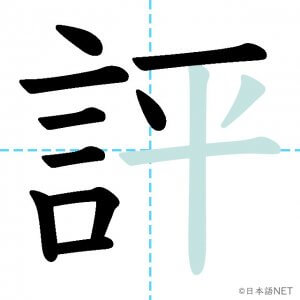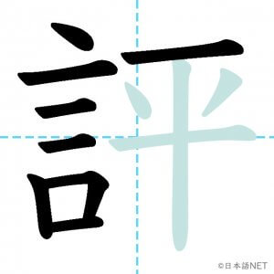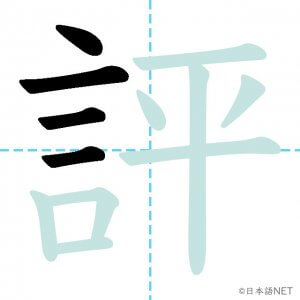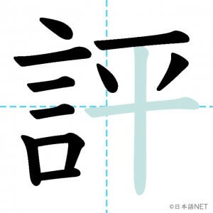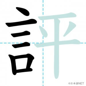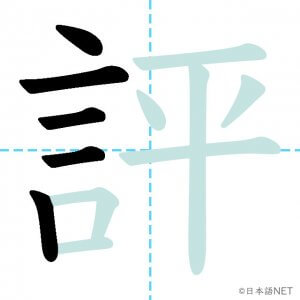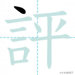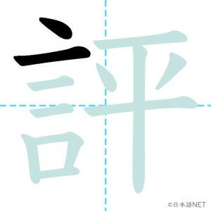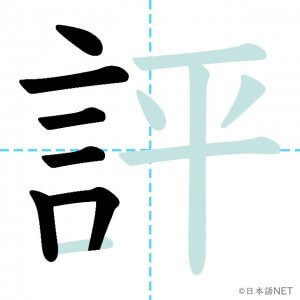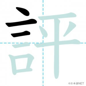 N2 漢字漢字【JLPT N2漢字】「評」の意味・読み方・書き順 2021年4月8日 2021年4月8日 Facebook postはてブLINEPocketFeedlyfa-exclamation-triangle記事内に商品プロモーションが含まれる場合があります目次1 「評」の漢字について2 「評」の書き順3 「評」を含む言葉4 関連書籍「評」の漢字について読み方音読みひょう訓読み-意味to evaluate部首言画数12JLPTレベルN2 「評」の書き順1画目2画目3画目4画目5画目6画目7画目8画目9画目10画目11画目12画目「評」を含む言葉評価(ひょうか)批評(ひひょう)評判(ひょうばん)好評(こうひょう)不評(ふひょう)評論(ひょうろん)書評(しょひょう)定評(ていひょう)風評(ふうひょう)関連書籍 日本語総まとめ N2 漢字 [英語・ベトナム語版] Nihongo Soumatome N2 Kanji (English/Vietnamese Edition) Amazon 楽天市場 Yahooショッピング 新完全マスター漢字 日本語能力試験N2 Amazon 楽天市場 Yahooショッピング 日本語を学ぶ外国人のための これで覚える! 漢字字典2500ナツメ社 Amazon 楽天市場 Yahooショッピング Facebook postはてブLINEPocketFeedly