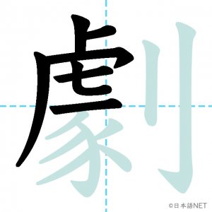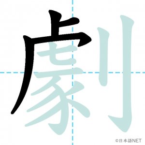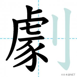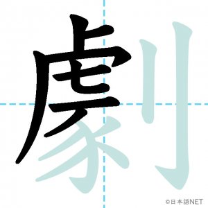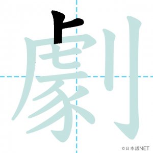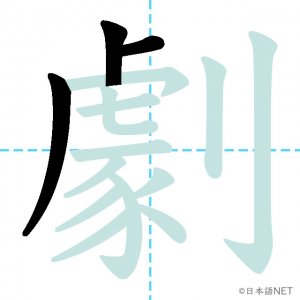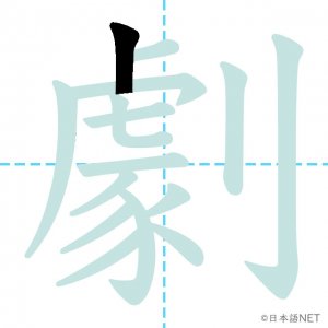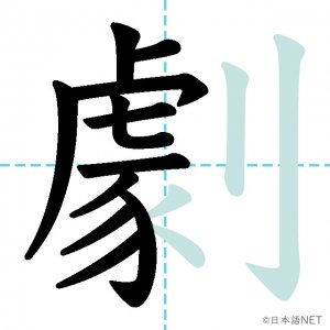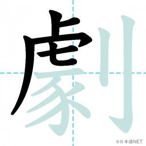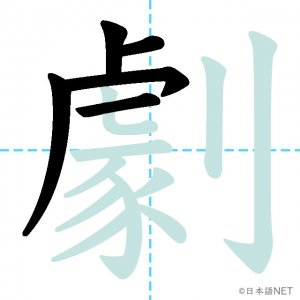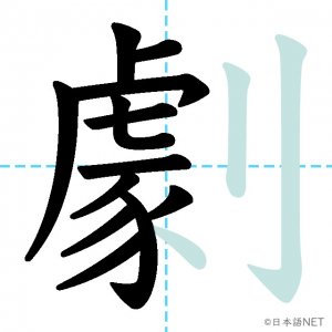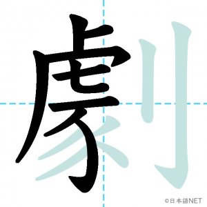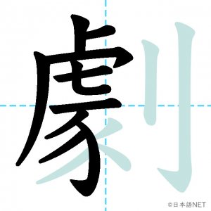 N2 漢字漢字【JLPT N2漢字】「劇」の意味・読み方・書き順 2021年4月23日 2021年4月23日 Facebook postはてブLINEPocketFeedlyfa-exclamation-triangle記事内に商品プロモーションが含まれる場合があります目次1 「劇」の漢字について2 「劇」の書き順3 「劇」を含む言葉4 関連書籍「劇」の漢字について読み方音読みげき訓読み-意味drama / play部首刀画数15JLPTレベルN2 「劇」の書き順1画目2画目3画目4画目5画目6画目7画目8画目9画目10画目11画目12画目13画目14画目15画目「劇」を含む言葉劇(げき)劇場(げきじょう)劇団(げきだん)喜劇(きげき)寸劇(すんげき)演劇(えんげき)惨劇(さんげき)劇的(げきてき)関連書籍 日本語総まとめ N2 漢字 [英語・ベトナム語版] Nihongo Soumatome N2 Kanji (English/Vietnamese Edition) Amazon 楽天市場 Yahooショッピング 新完全マスター漢字 日本語能力試験N2 Amazon 楽天市場 Yahooショッピング 日本語を学ぶ外国人のための これで覚える! 漢字字典2500ナツメ社 Amazon 楽天市場 Yahooショッピング Facebook postはてブLINEPocketFeedly