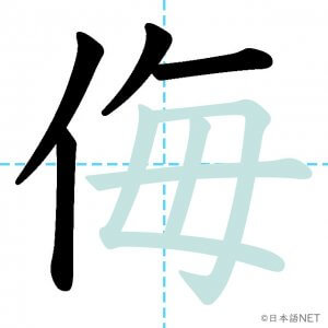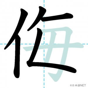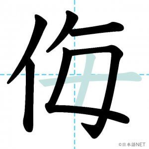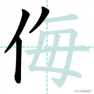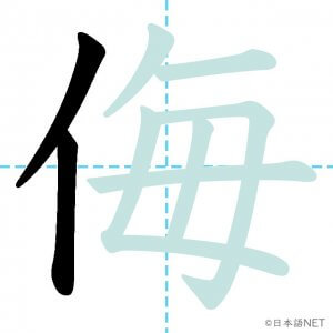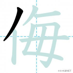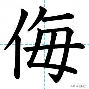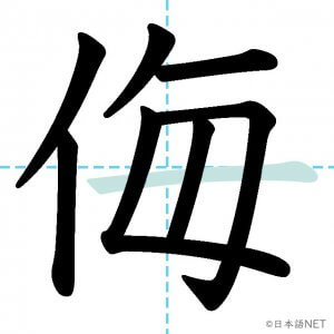 N1 漢字漢字【JLPT N1漢字】「侮」の意味・読み方・書き順 2021年6月16日 2021年6月16日 Facebook postはてブLINEPocketFeedlyfa-exclamation-triangle記事内に商品プロモーションが含まれる場合があります目次1 「侮」の漢字について2 「侮」の書き順3 「侮」を含む言葉4 関連書籍「侮」の漢字について読み方音読みぶ訓読みあなど-る意味to scorn / to insult / to despise / to make light of部首人(亻)画数8JLPTレベルN1 「侮」の書き順1画目2画目3画目4画目5画目6画目7画目8画目「侮」を含む言葉侮辱(ぶじょく)侮る(あなどる)関連書籍 日本語総まとめ N1 漢字 [英語・ベトナム語版] (「日本語能力試験」対策) Amazon 楽天市場 Yahooショッピング 新完全マスター漢字 日本語能力試験N1 Amazon 楽天市場 Yahooショッピング 日本語を学ぶ外国人のための これで覚える! 漢字字典2500ナツメ社 Amazon 楽天市場 Yahooショッピング Facebook postはてブLINEPocketFeedly