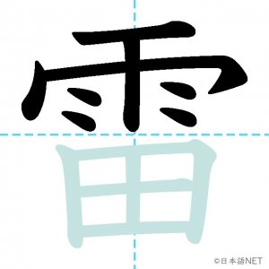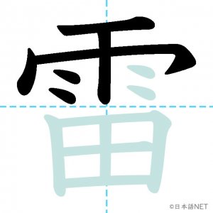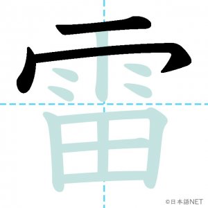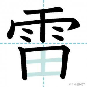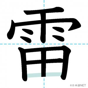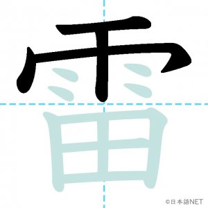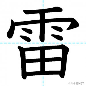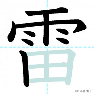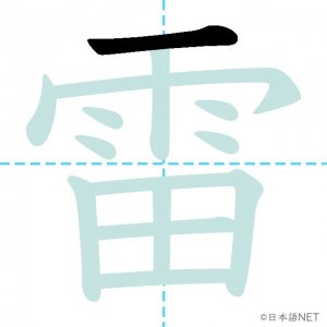 N1 漢字漢字【JLPT N1漢字】「雷」の意味・読み方・書き順 2021年8月3日 2021年8月3日 Facebook postはてブLINEPocketFeedlyfa-exclamation-triangle記事内に商品プロモーションが含まれる場合があります目次1 「雷」の漢字について2 「雷」の書き順3 「雷」を含む言葉4 関連書籍「雷」の漢字について読み方音読みらい訓読みかみなり意味thunder / lightning部首雨画数13JLPTレベルN1 「雷」の書き順1画目2画目3画目4画目5画目6画目7画目8画目9画目10画目11画目12画目13画目「雷」を含む言葉雷(かみなり)雷鳴(らいめい)落雷(らくらい)雷雨(らいう)地雷(じらい)関連書籍 日本語総まとめ N1 漢字 [英語・ベトナム語版] (「日本語能力試験」対策) Amazon 楽天市場 Yahooショッピング 新完全マスター漢字 日本語能力試験N1 Amazon 楽天市場 Yahooショッピング 日本語を学ぶ外国人のための これで覚える! 漢字字典2500ナツメ社 Amazon 楽天市場 Yahooショッピング Facebook postはてブLINEPocketFeedly