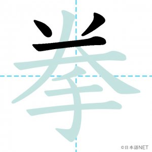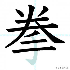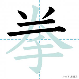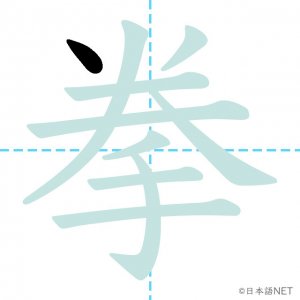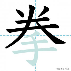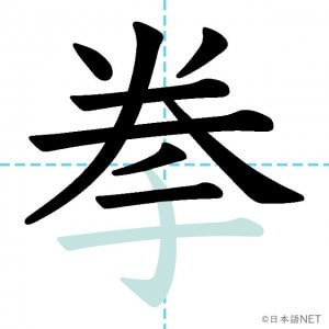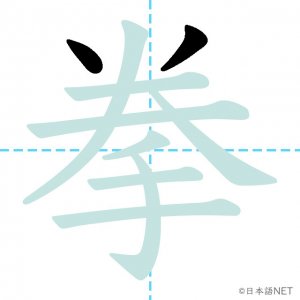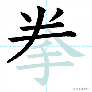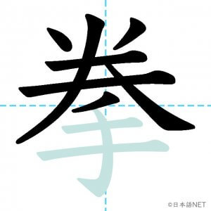 N1 漢字漢字【JLPT N1漢字】「拳」の意味・読み方・書き順 2021年8月16日 2021年8月16日 Facebook postはてブLINEPocketFeedlyfa-exclamation-triangle記事内に商品プロモーションが含まれる場合があります目次1 「拳」の漢字について2 「拳」の書き順3 「拳」を含む言葉4 関連書籍「拳」の漢字について読み方音読みけん訓読みこぶし意味fist部首手(扌龵)画数10JLPTレベルN1 「拳」の書き順1画目2画目3画目4画目5画目6画目7画目8画目9画目10画目「拳」を含む言葉拳(こぶし)拳銃(けんじゅう)拳法(けんぽう)関連書籍 日本語総まとめ N1 漢字 [英語・ベトナム語版] (「日本語能力試験」対策) Amazon 楽天市場 Yahooショッピング 新完全マスター漢字 日本語能力試験N1 Amazon 楽天市場 Yahooショッピング 日本語を学ぶ外国人のための これで覚える! 漢字字典2500ナツメ社 Amazon 楽天市場 Yahooショッピング Facebook postはてブLINEPocketFeedly