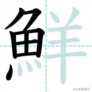 N1 漢字漢字【JLPT N1漢字】「鮮」の意味・読み方・書き順 2021年8月17日 2021年8月17日 Facebook postはてブLINEPocketFeedlyfa-exclamation-triangle記事内に商品プロモーションが含まれる場合があります目次1 「鮮」の漢字について2 「鮮」の書き順3 「鮮」を含む言葉4 関連書籍「鮮」の漢字について読み方音読みせん訓読みあざ-やか意味fresh / vivid / clear部首魚画数17JLPTレベルN1 「鮮」の書き順1画目2画目3画目4画目5画目6画目7画目8画目9画目10画目11画目12画目13画目14画目15画目16画目17画目「鮮」を含む言葉新鮮(しんせん)鮮やか(あざやか)鮮明(せんめい)北朝鮮(きたちょうせん)関連書籍 日本語総まとめ N1 漢字 [英語・ベトナム語版] (「日本語能力試験」対策) Amazon 楽天市場 Yahooショッピング 新完全マスター漢字 日本語能力試験N1 Amazon 楽天市場 Yahooショッピング 日本語を学ぶ外国人のための これで覚える! 漢字字典2500ナツメ社 Amazon 楽天市場 Yahooショッピング Facebook postはてブLINEPocketFeedly