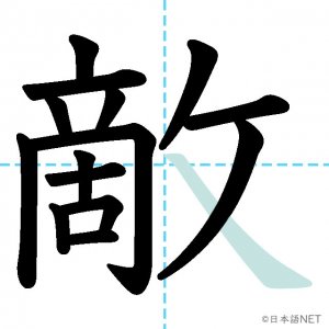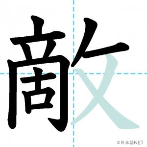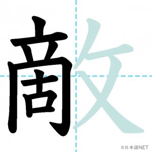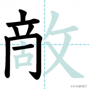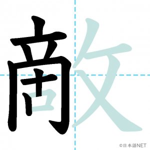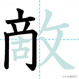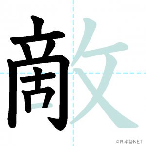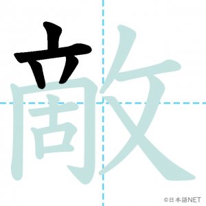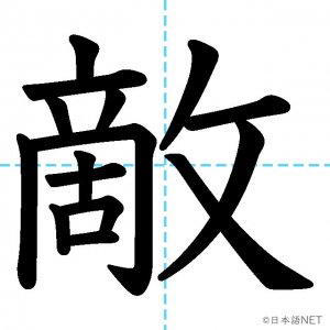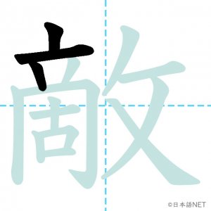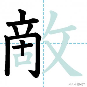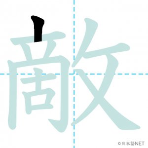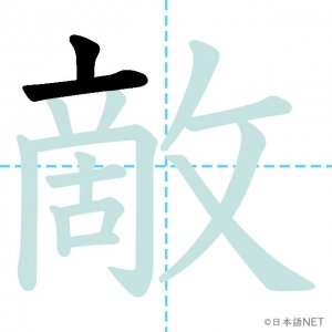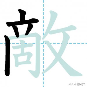 N1 漢字漢字【JLPT N1漢字】「敵」の意味・読み方・書き順 2021年9月4日 2021年9月4日 Facebook postはてブLINEPocketFeedlyfa-exclamation-triangle記事内に商品プロモーションが含まれる場合があります目次1 「敵」の漢字について2 「敵」の書き順3 「敵」を含む言葉4 関連書籍「敵」の漢字について読み方音読みてき訓読みかたき意味enemy部首攴(攵)画数15JLPTレベルN1 「敵」の書き順1画目2画目 3画目4画目5画目6画目7画目8画目9画目10画目11画目12画目13画目14画目15画目「敵」を含む言葉敵(てき)素敵(すてき)匹敵(ひってき)天敵(てんてき)外敵(がいてき)関連書籍 日本語総まとめ N1 漢字 [英語・ベトナム語版] (「日本語能力試験」対策) Amazon 楽天市場 Yahooショッピング 新完全マスター漢字 日本語能力試験N1 Amazon 楽天市場 Yahooショッピング 日本語を学ぶ外国人のための これで覚える! 漢字字典2500ナツメ社 Amazon 楽天市場 Yahooショッピング Facebook postはてブLINEPocketFeedly