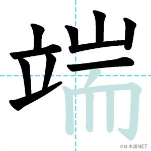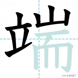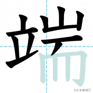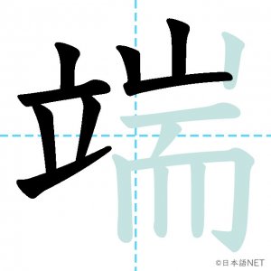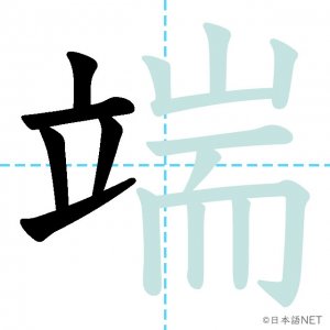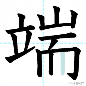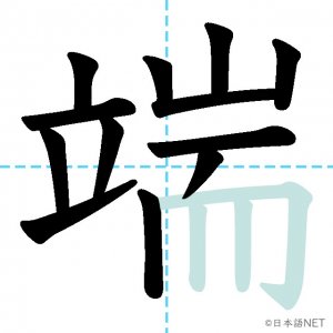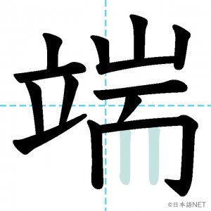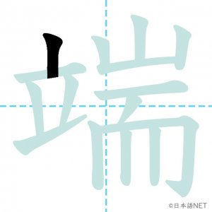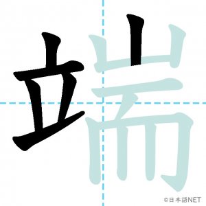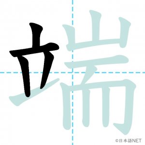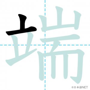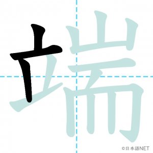N1 漢字漢字【JLPT N1漢字】「端」の意味・読み方・書き順 2021年10月20日 2021年10月20日 Facebook postはてブLINEPocketFeedlyfa-exclamation-triangle記事内に商品プロモーションが含まれる場合があります目次1 「端」の漢字について2 「端」の書き順3 「端」を含む言葉4 関連書籍「端」の漢字について読み方音読みたん訓読みはし はた は意味edge / end部首立画数14JLPTレベルN1 「端」の書き順1画目2画目3画目4画目5画目6画目7画目8画目9画目10画目11画目12画目13画目14画目「端」を含む言葉端(はし)途端(とたん)末端(まったん)先端(せんたん)極端(きょくたん)半端(はんぱ)関連書籍 日本語総まとめ N1 漢字 [英語・ベトナム語版] (「日本語能力試験」対策) Amazon 楽天市場 Yahooショッピング 新完全マスター漢字 日本語能力試験N1 Amazon 楽天市場 Yahooショッピング 日本語を学ぶ外国人のための これで覚える! 漢字字典2500ナツメ社 Amazon 楽天市場 Yahooショッピング Facebook postはてブLINEPocketFeedly