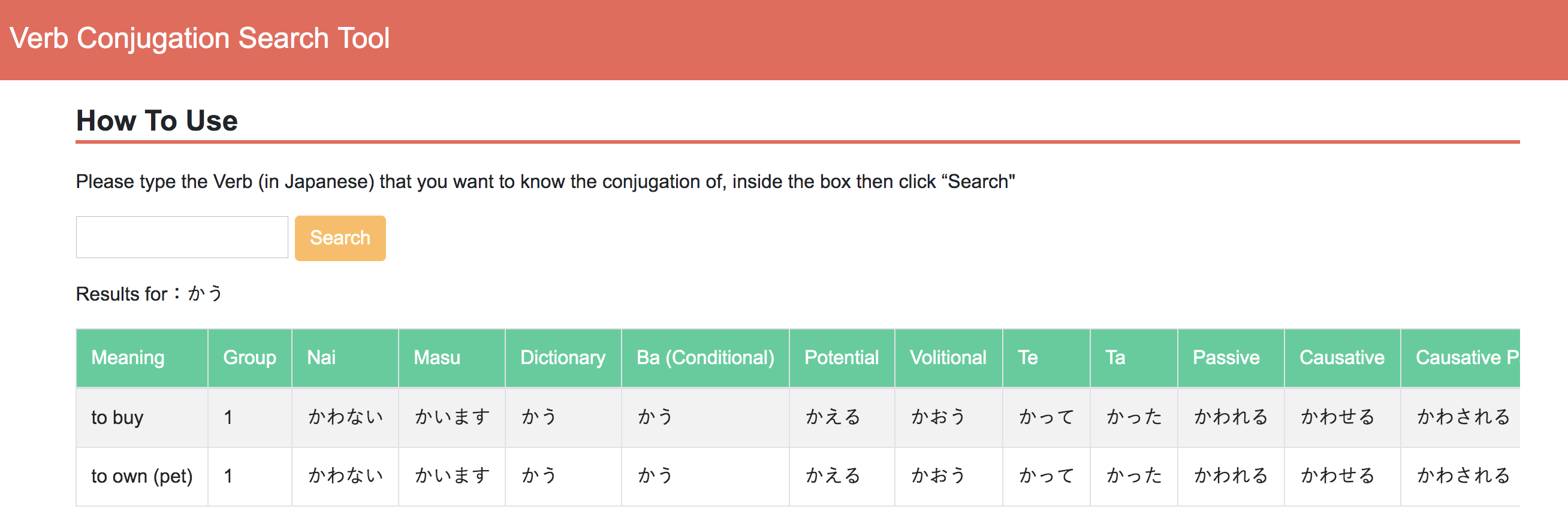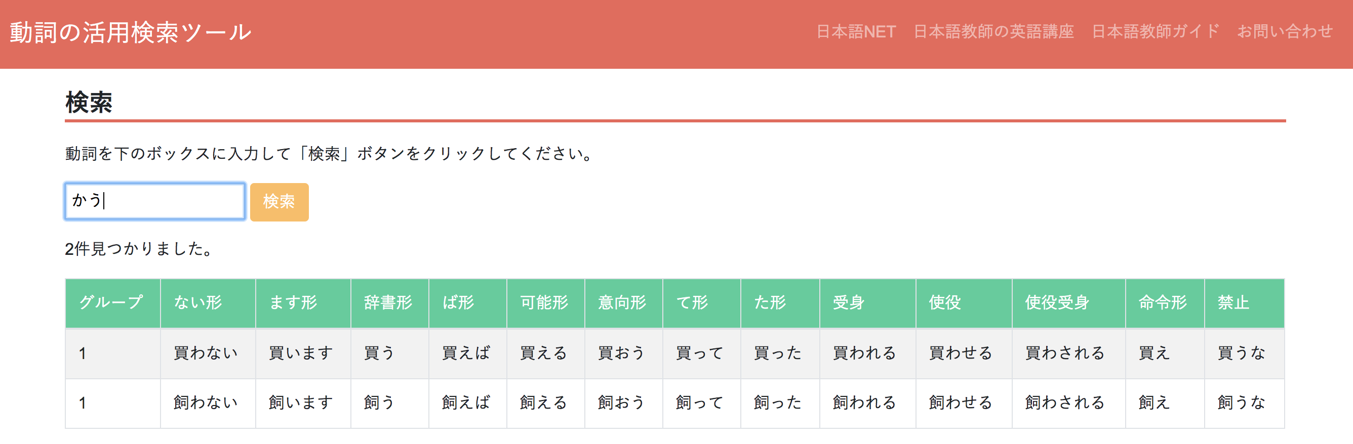 「ない形」や「辞書形」など、知りたい動詞の活用が簡単に調べられるツールです。